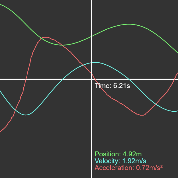 Draw an acceleration graph and it shows what the velocity and position graphs will look like, along with a particle which follows your graph.
